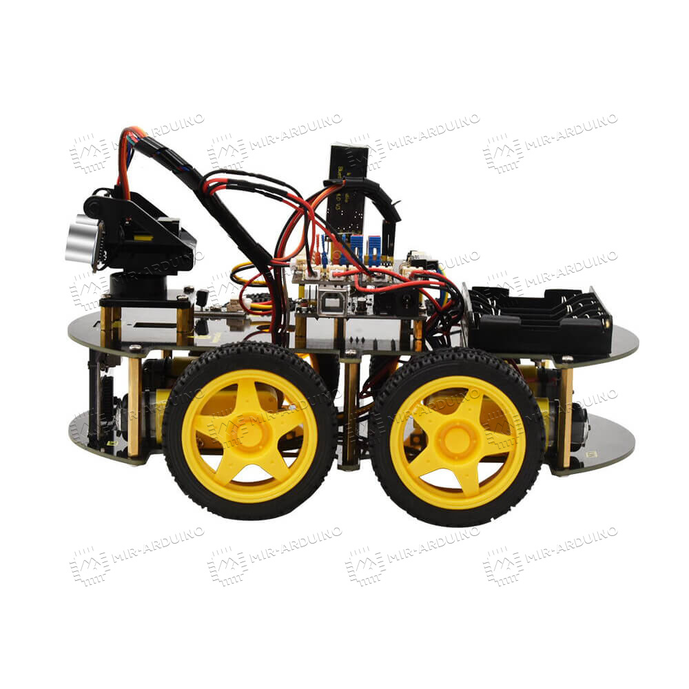 Набор для моделирования Ардуино (Arduino) 4WD BT Car V2.0 позволит спроектировать робот-автомобиль. Умный конструктор подойдет взрослым и детям от 14 лет, которые интересуются электроникой и робототехникой. Набор не требует использования паяльника, поэтому полностью безопасен для ребенка. Созданный робот способен проходить через препятствия, следовать за объектом, передвигаться по заданной траектории. Модернизировать механизм можно путем установки дополнительных датчиков, расширяющих его функционал. Есть возможность дистанционного управления через смартфон, робот синхронизируется с телефоном по Bluetooth.