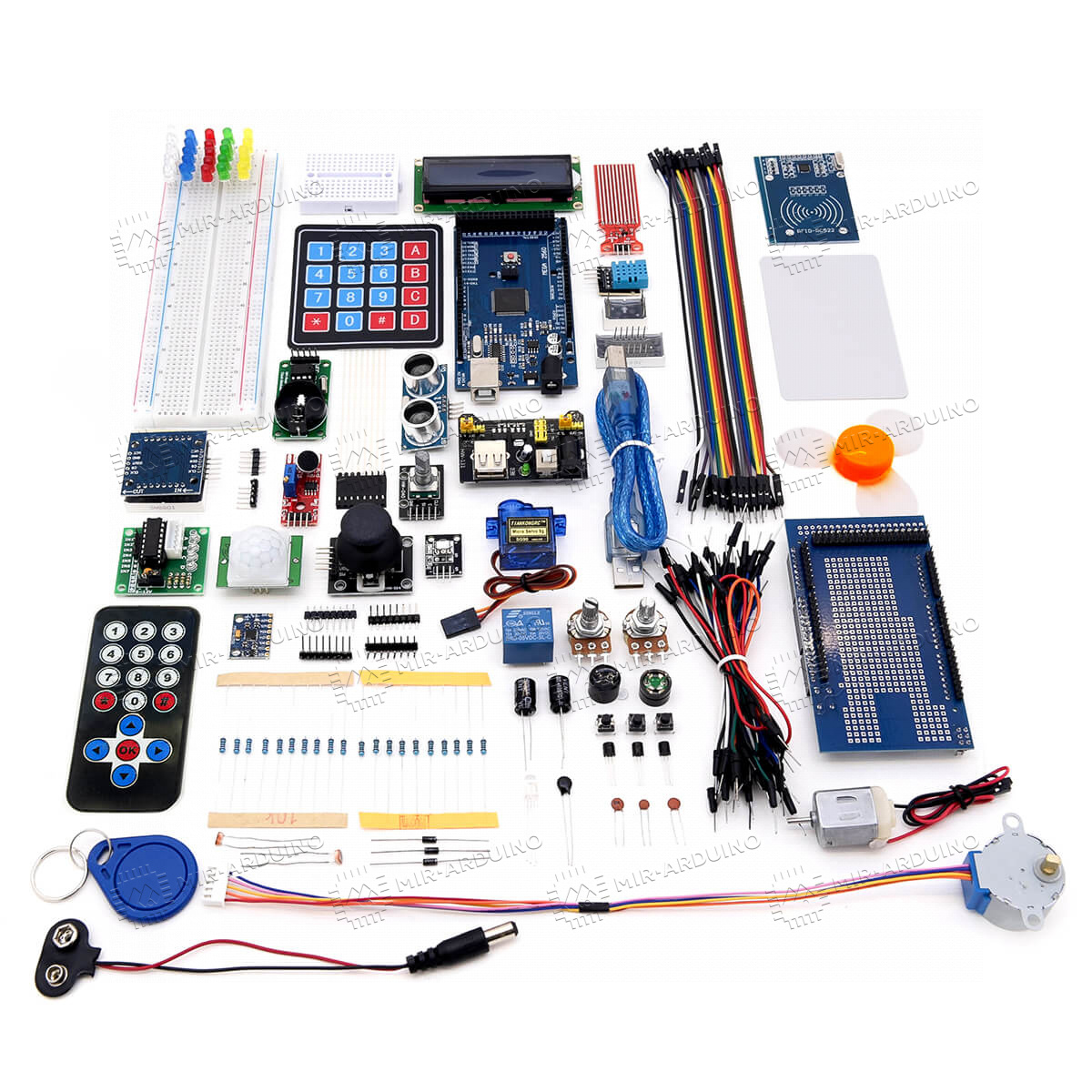 Ардуино Mega Kit включает в себя одноименную плату с процессором и комплект перемычек, датчиков, резисторов, переключателей, светодиодов. Позволяет создавать электронные схемы без пайки. Подойдет для новичков, для работы с набором не нужны знания в области программирования. Плата подключается к компьютеру через USB интерфейс, специальный программатор не требуется.